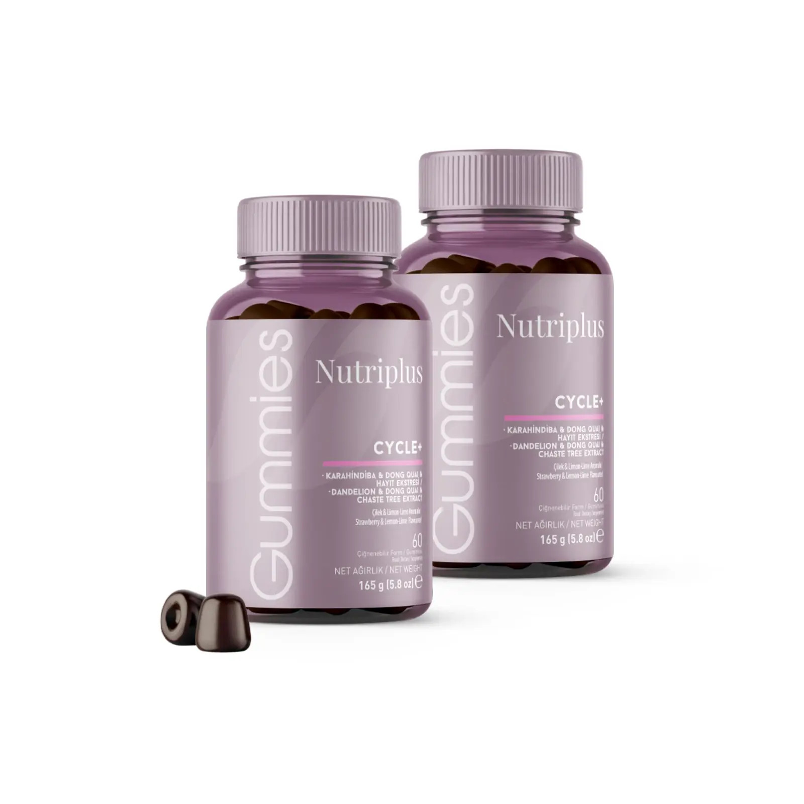 Popis: Nutriplus CYCLE+ . Gumené cukríky s extraktom z koreňa púpavy lekárskej, extraktom z koreňa Dong Quai – angelika čínska, s extraktom z ovocia vitexu jahňacieho a extraktom z kvetov levandule úzkolistej, s vitamínmi B6, B1,E a železom; s jahodovou a citrónovo-limetkovou príchuťou. Obsahuje sladidlo. Výživový doplnok, gumené cukríky. Hmotnosť: 165 g (60 gumených cukríkov).